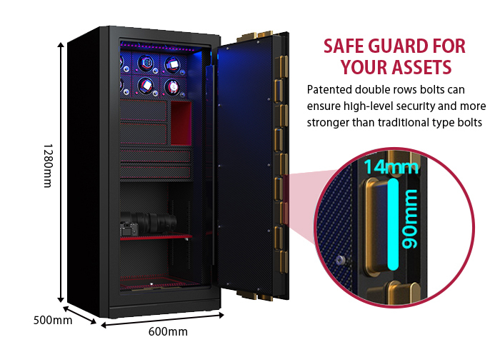 Double Rows Bolts: This is a critical security feature. Instead of a single bolt on each side, double rows of thick, motorized locking bolts shoot out from the door into the frame. This creates an immensely strong seal that is extremely difficult to pry open, significantly enhancing the safe's defensive capabilities.